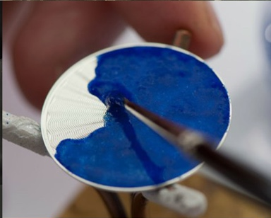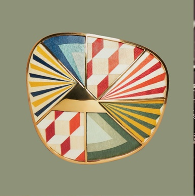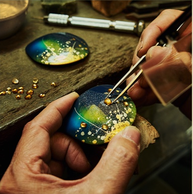 Composed of a variety of gold leaf, silk screen ink, and precious stones atop a convex surface, each Gem is laboriously made via the hands of a collective of master artisans. Created by artist and founder Bertrand Mak, it is a handcrafted jewel as well as transformable object of art that can be crowned onto the house's wearable creations.
